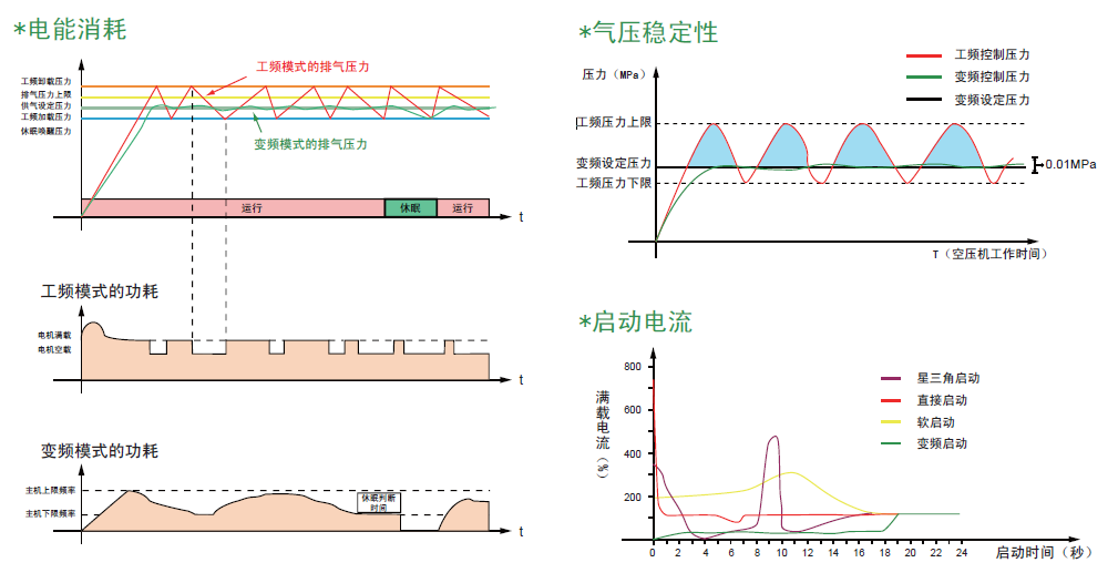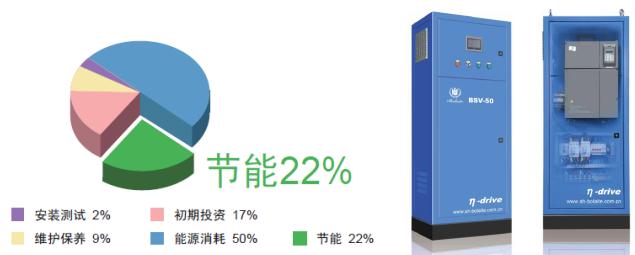 由于外挂变频系统的输出频率是根据实际负荷的变化而变化,这样就减少了空压机卸载时间,减少电机的空转损耗,达到高性价比节能目的。